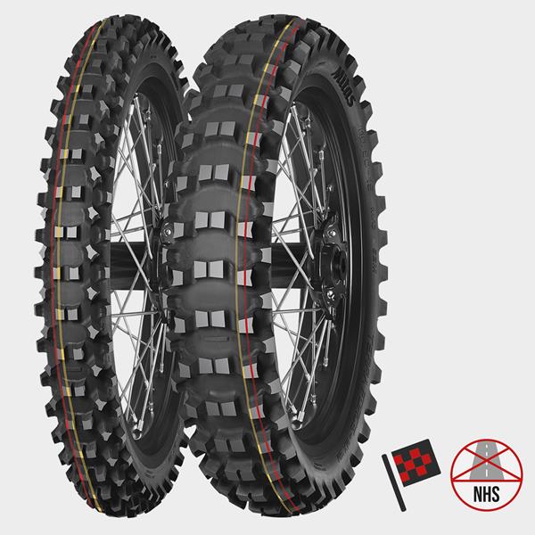 Motocross tyres for varied conditions, from soft to medium. These feature a tapered knob design that chisels its way through the soft ground to get traction. The high well-spaced knobs are tied at the base to be reinforced for a longer life.